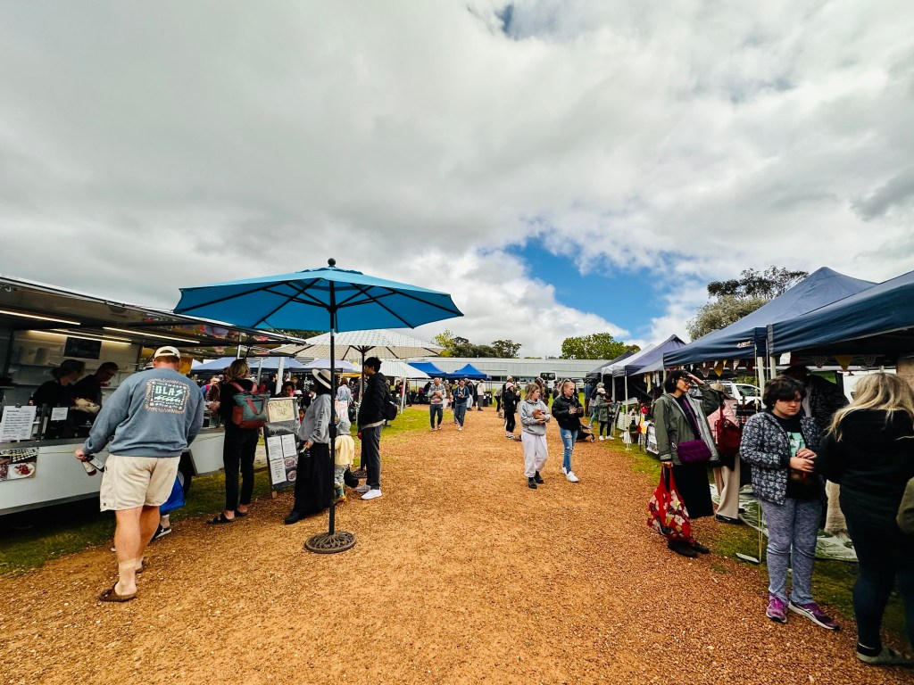 The weather still isn’t proving to be as reliably hot as the tourism books would have you believe. As we’re finding out from the locals, it’s actually quite normal for the climate to be a bit iffy at this time of year. The real heat comes in December, but we won’t be here for that, so we’ll just make do with what we’re given. In any case, Saturday mornings welcome a local farmer’s market to Margaret River, so we headed down the road to check that out. Lots of lovely stalls offering local produce, such as marmalades, lion’s mane mushrooms (all sold out by 10am!), nougat, fruit and veg, pastries, cheese, truffle butter (truffles are a big thing down here) as well as a few vans selling coffee and smoothies. It was a really nice setup. Not too big, an easy loop to walk around, which clearly draws in a reasonable crowd each week. There were even people having picnics in the middle of the loop. Everything seems very well thought-out here in terms of people and social mobility, and there’s clearly plenty of investment in community and giving people opportunities to gather and stay healthy.