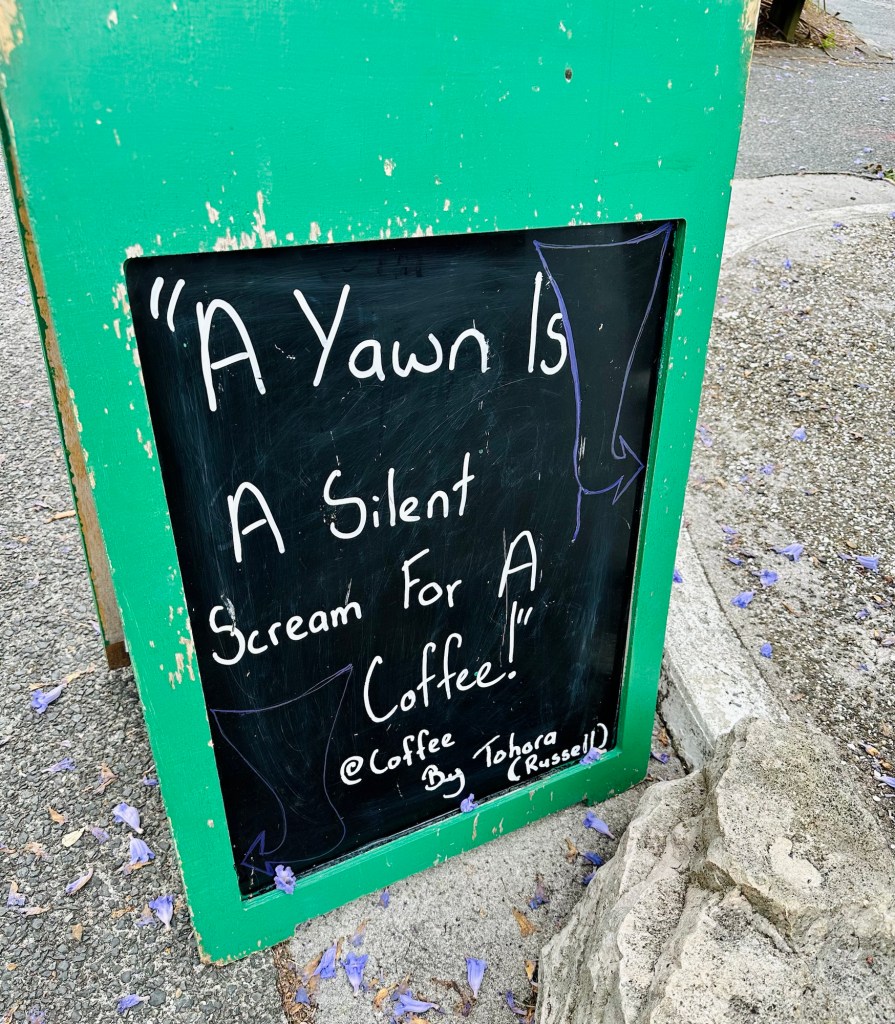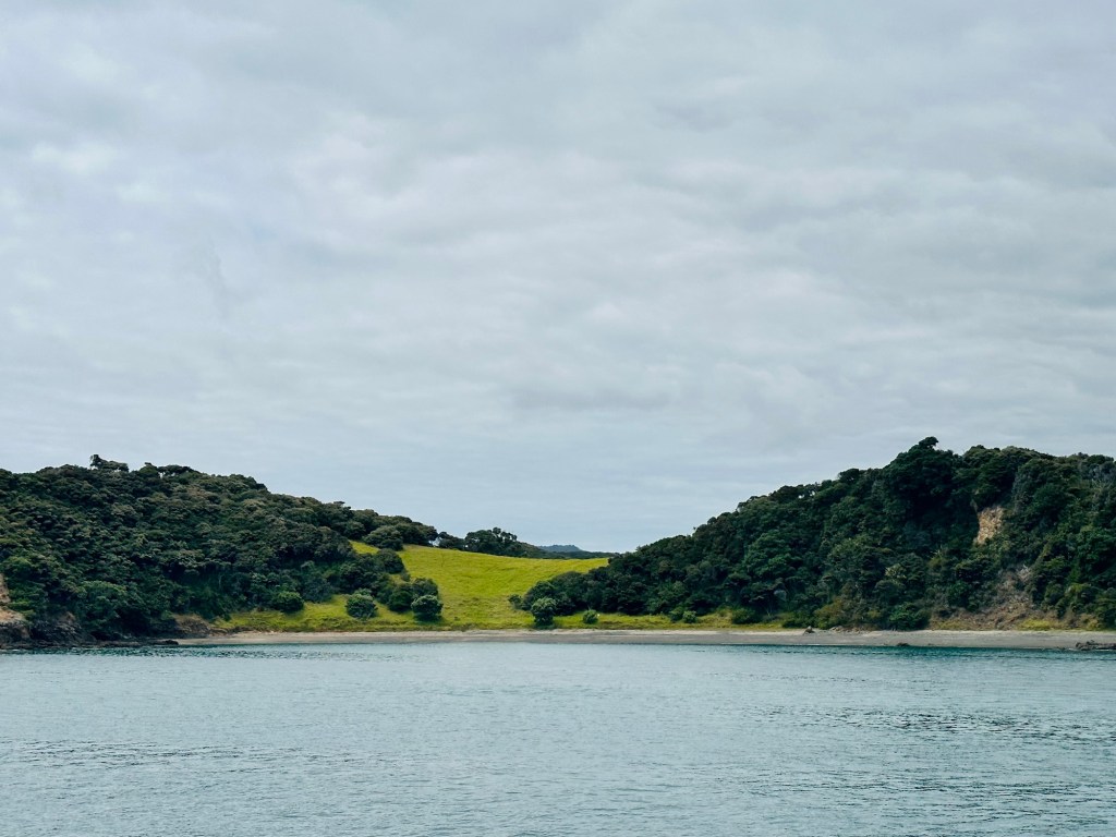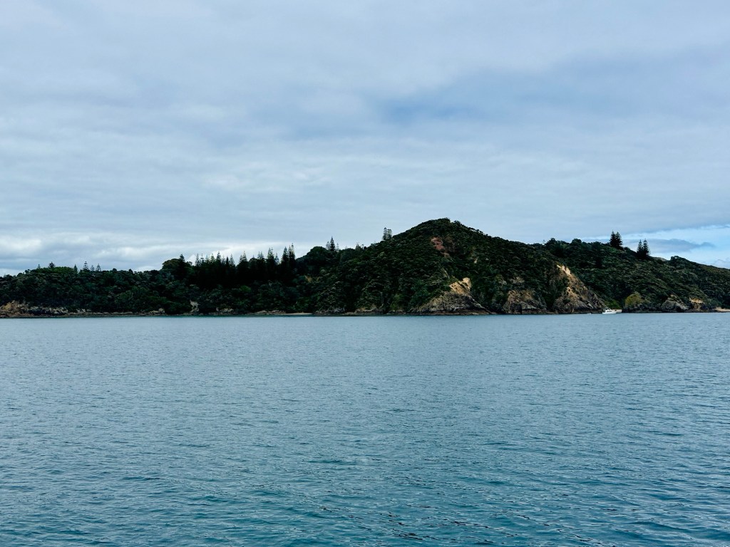 Having booked a 4.5hr Bay of Islands cruise over the phone the day before, we knew we had to be at Russell Harbour by 9:10am, where they’d come and pick us up after first scooping up passengers from Paihia. We left the campsite in good time, but needed to buy some snacks from the bakery or supermarket in Russell, both of which had limited lunch options. We also both wanted another coffee before setting sail…