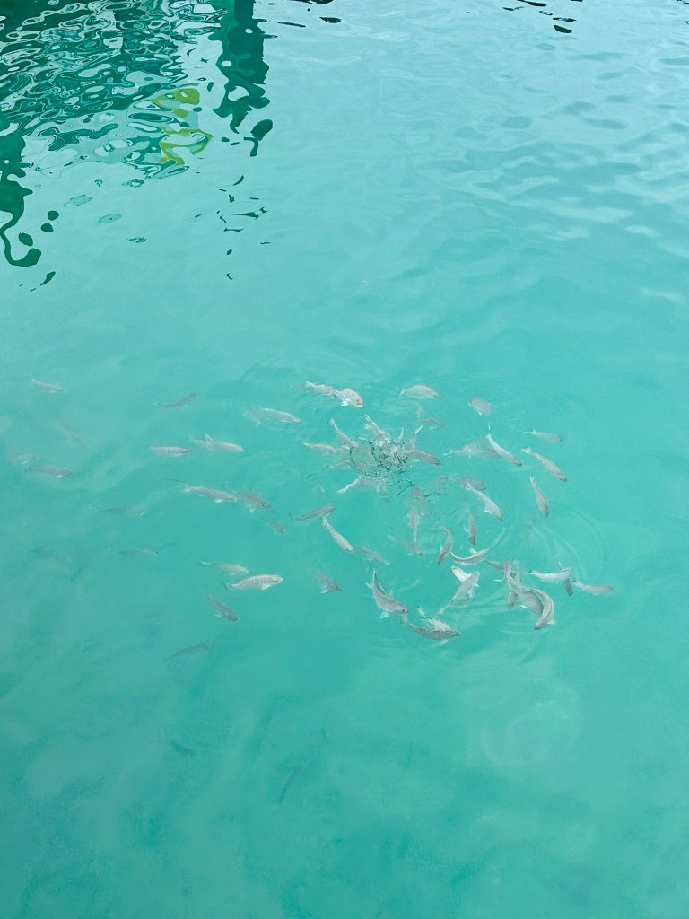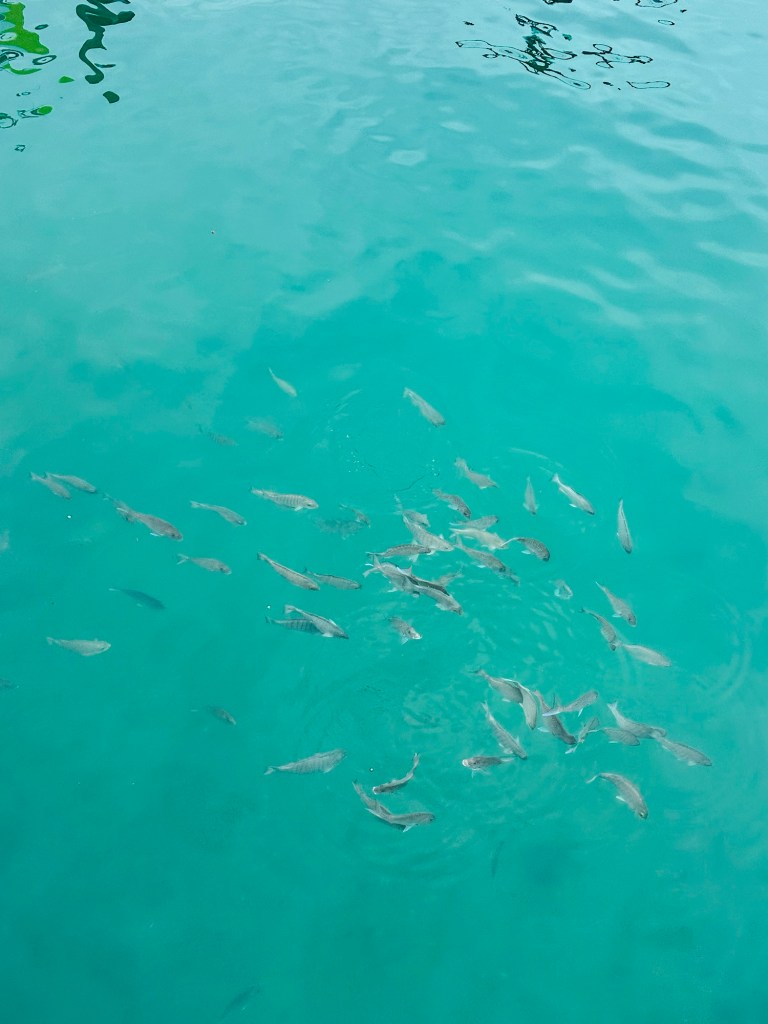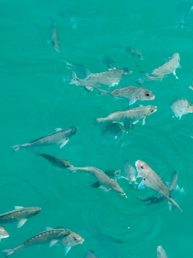 We walked back onto the jetty, which was busy with another boatful of people piling onto the island. We squeezed past them and managed to make it back to our crew who were about to feed the fish.