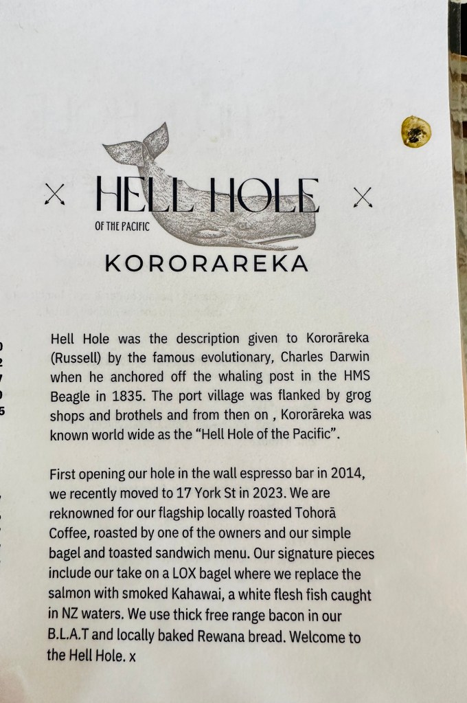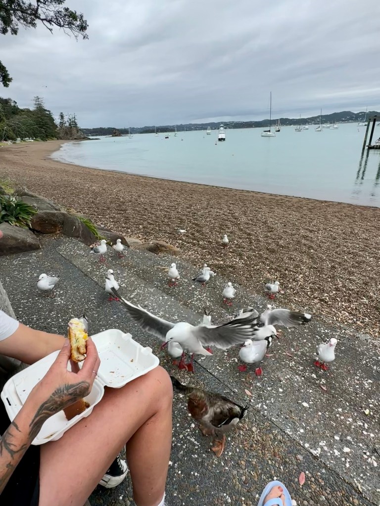 Once back in Russell, we walked around some of the shops and admired some of the local crafts and artwork. We also stopped at Hell Hole cafe, where we each got a coffee and Anneke got the world’s biggest toastie, which we took to the waterfront.