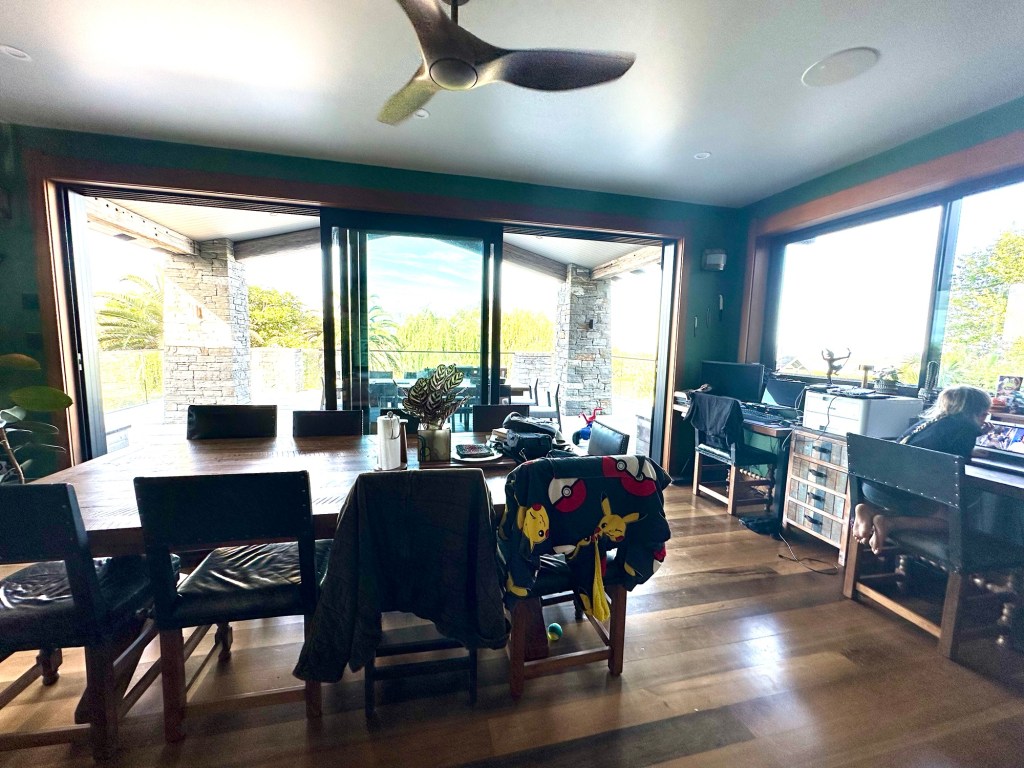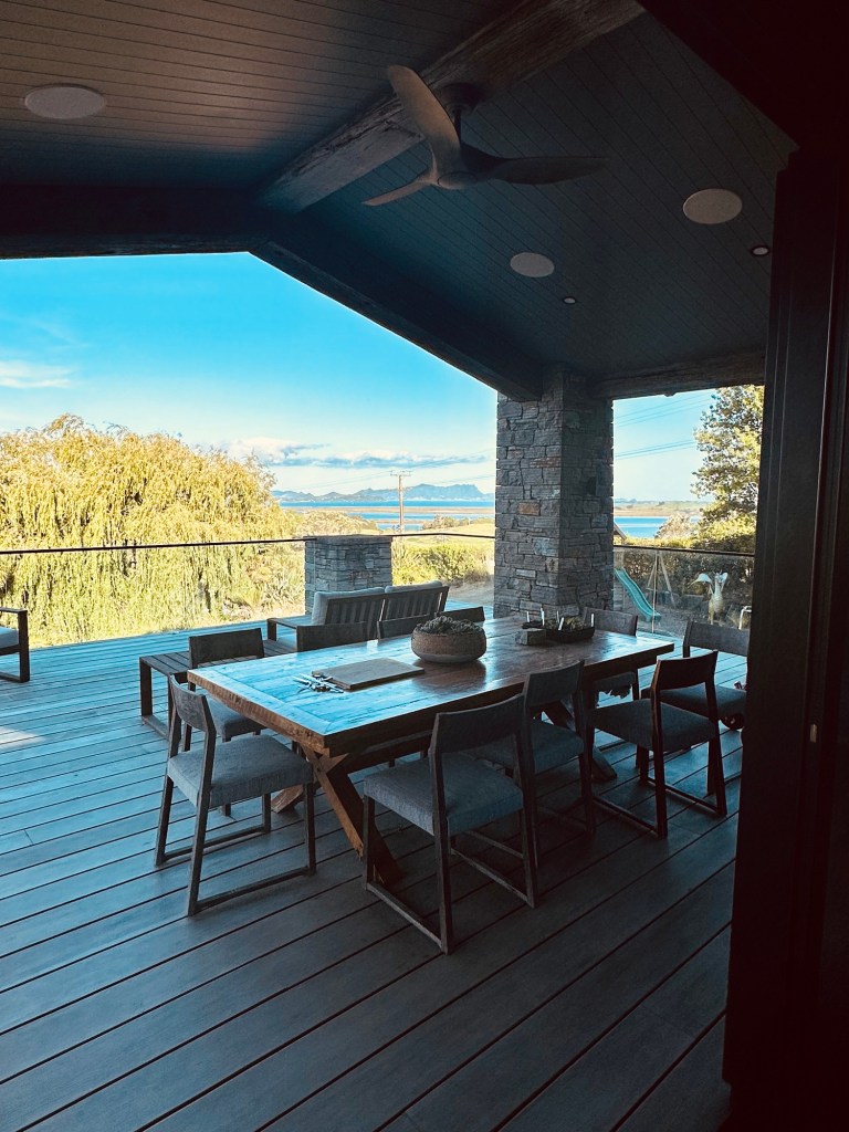 Dave and his wife Vanessa had very kindly invited us to have dinner and stay the night as part of our trip back to Anneke’s home in Puhoi. We walked in to find Vanessa cooking up a storm, but in the most relaxed and amazing setting. I really wanted to take a picture of her kitchen but it seemed rude to while she was busy making dinner. Instead, we gawped at their outdoor setup opposite the open plan kitchen.