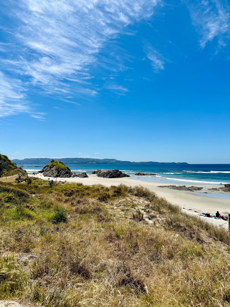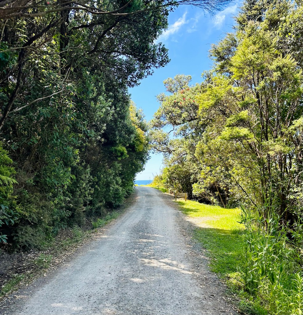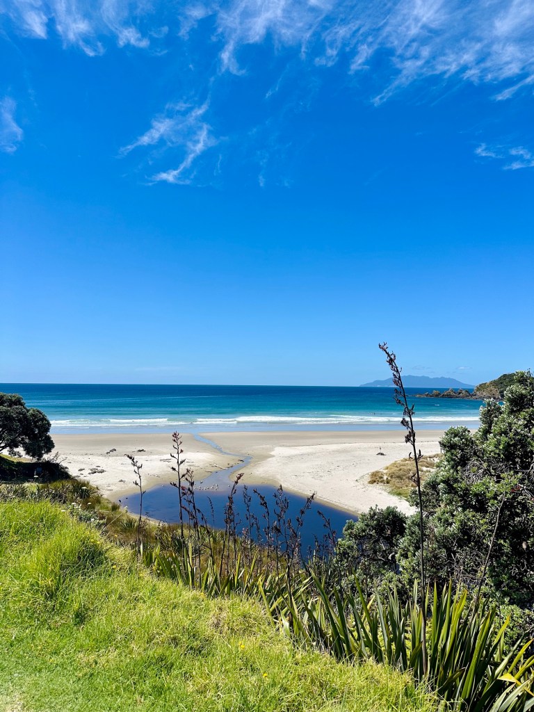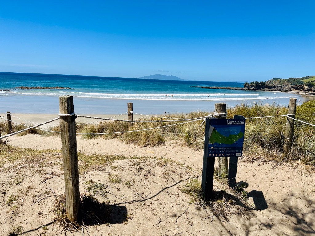 Our next stop was Tawharanui (pronounced Taffaranooee (wh = f) Open Sanctuary, where we hoped to see some of the protected native NZ birds that live there. We both used the toilets (this will become relevant later) and then walked towards the stunning beach at the edge of the park. So tempting to go for a swim but we were a bit short on time.
