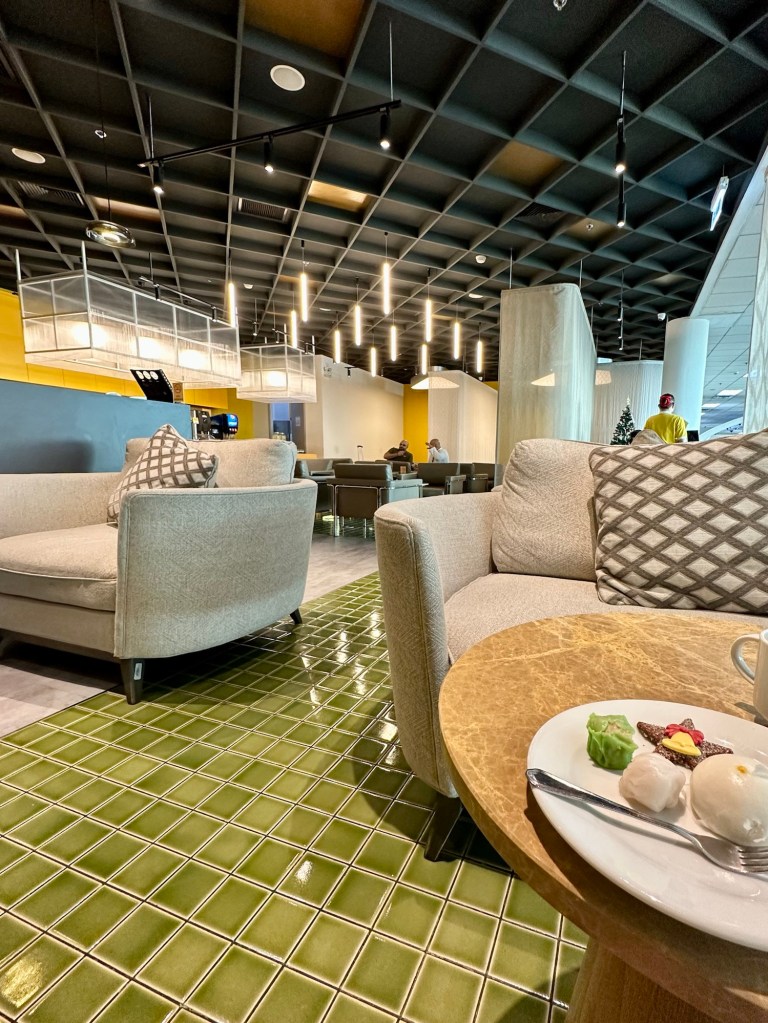 The lounge was nice but pretty basic. They had a coffee machine, water, juices, toast and jams etc, dim sum, biscuits and fresh fruit, and charging points at each seating area, which came in very handy as usual.