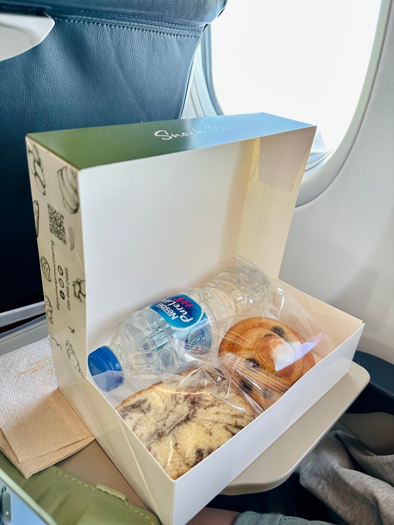 I soon found out, as it turns out I got a complimentary snack box on the flight. I ate the slice of marble cake but left the raisin pastry because me and raisins don’t get along, and also because I wasn’t convinced the quality of this pastry was going to outweigh the cons of eating it.