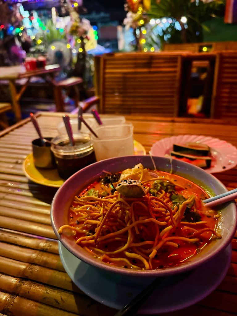 Khao soi is a delicious noodle dish in a broth/sauce with crispy noodles on top. Yum!